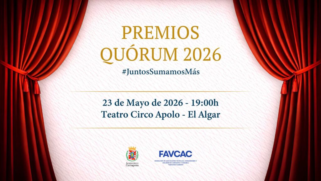 El movimiento vecinal de Cartagena tiene una cita ineludible el próximo 23 de mayo. A las 19:00 horas, el emblemático Teatro Circo Apolo del Algar, un edificio modernista que este año aporta un carácter especialmente singular al evento, acogerá la decimosexta edición de los Premios Quórum, la gran fiesta anual de las asociaciones de vecinos de la ciudad organizada por la Federación de Asociaciones de Vecinos de Cartagena y su Comarca (FAVCAC), con el patrocinio del Ayuntamiento de Cartagena.